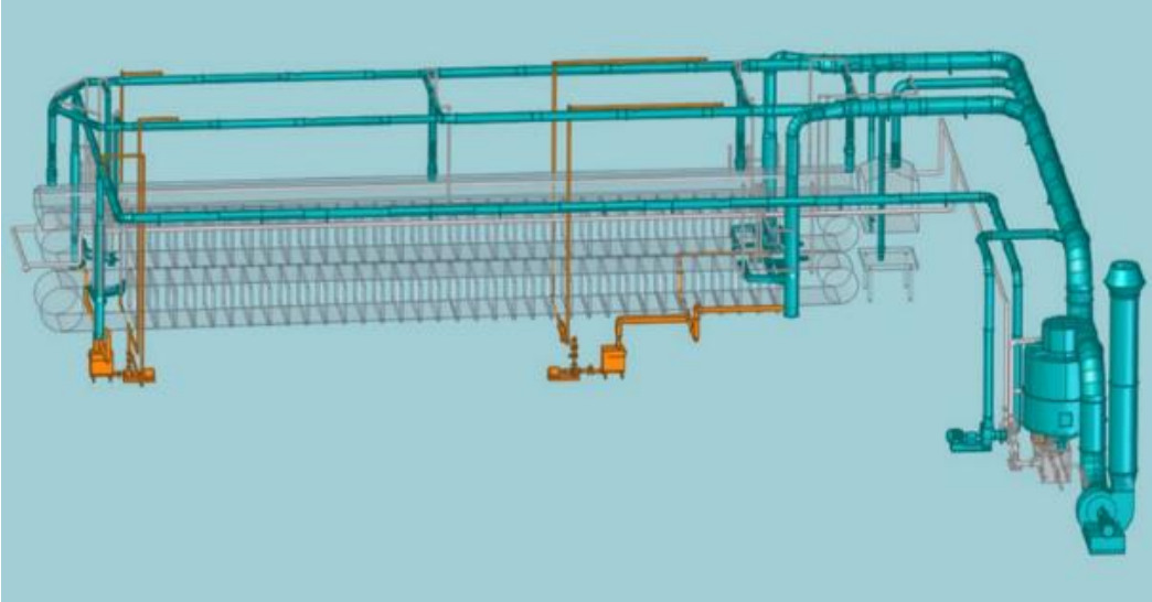 我司專門設計的噴嘴把特殊液體均勻地與氣體混合形成泡沫,噴入接近抽吸口處的風管中,使風管隨時充滿氣泡。氣泡降低尾氣溫度的同時、把尾氣中的游離甲醛、汽化潤滑油、木質粉塵、纖維、石蠟、乙醇、苯酚、水蒸汽、顆粒物等有毒、有害、易燃物送入特殊的氣/液旋風分離器,把潔凈、降溫后的蒸汽通過煙囪排出;把其它雜質隨液體通過沉降槽沉降后,經淤泥自動刮板機把固體物刮出用做能源工廠的燃料,水過濾后循環(huán)再利用。如此保證抽吸系統(tǒng)保持長時間、高效、穩(wěn)定的抽吸效果,防止因風管黏結而導致壓機著火,防止可能的鋼帶變形和損失!